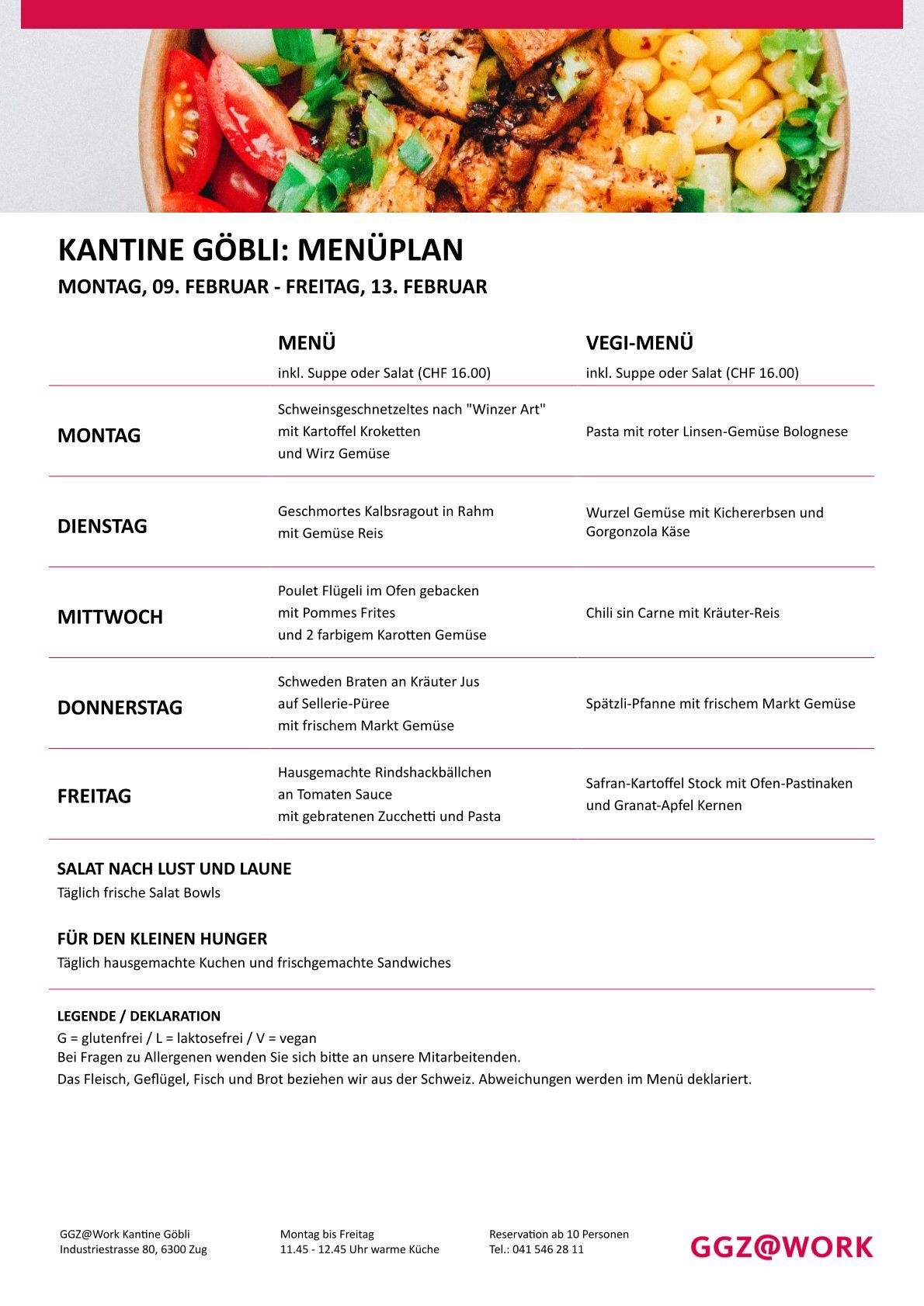 Das engagierte Team in der Kantine Göbli kreiert abwechslungsreiche und gesunde Menüs. Am reichhaltigen Salatbüffet können Sie einen Teller mit knackig frischen Salaten nach Belieben zusammenstellen.